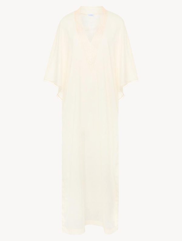 The embodiment of exceptional craft and striking sophistication, the powerfully feminine Luci Di Capri Kaftan in Champagne is cut to a timeless and relaxed silhouette with a v-neck and side splits. Crafted from a lightweight, ethereal cotton voile for luxurious comfort, it’s finished beaded detailing at the neckline and sleeves, and made to be treasured forever.