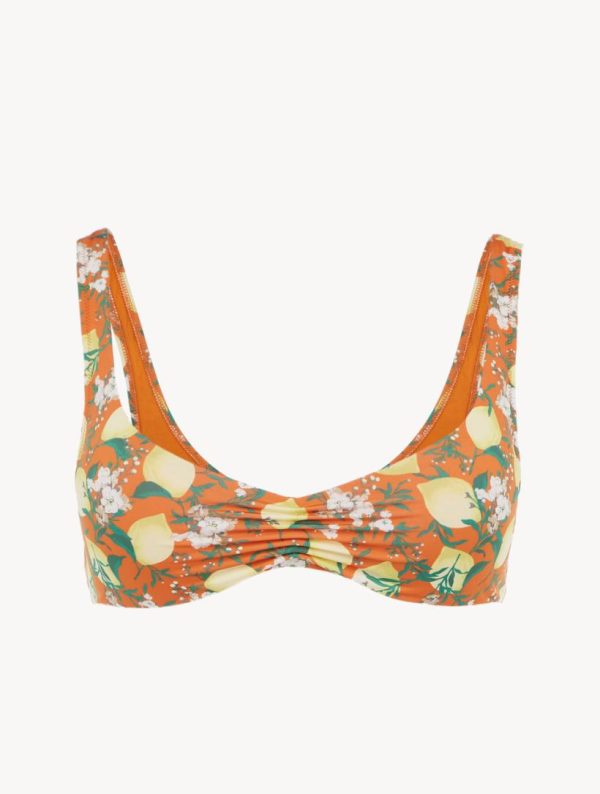 Capturing the irresistible mood of an Italian summer, the Amalfi Twist Bikini Top in orange features a fresh and vibrant print of lemons and flowers. Cut to a timeless and flattering silhouette, it has a daring scooped neck and removable padding. Mix and match with the co-ordinating Briefs for flawless holiday style.