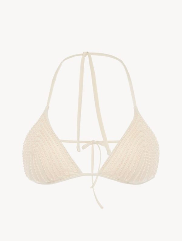 The embodiment of exceptional craft and striking sophistication, the powerfully feminine Luci Di Capri Triangle Bikini Top in Champagne is cut to a timeless silhouette for soft support with removable padding. Crafted from luxurious soft-stretch microfiber that perfectly frames and flatters, it’s finished with undulating waves of beads, embroidered on a tulle panel with our signature soutache technique. Complete the look with the Luci Di Capri High-Waisted or Bikini Briefs.