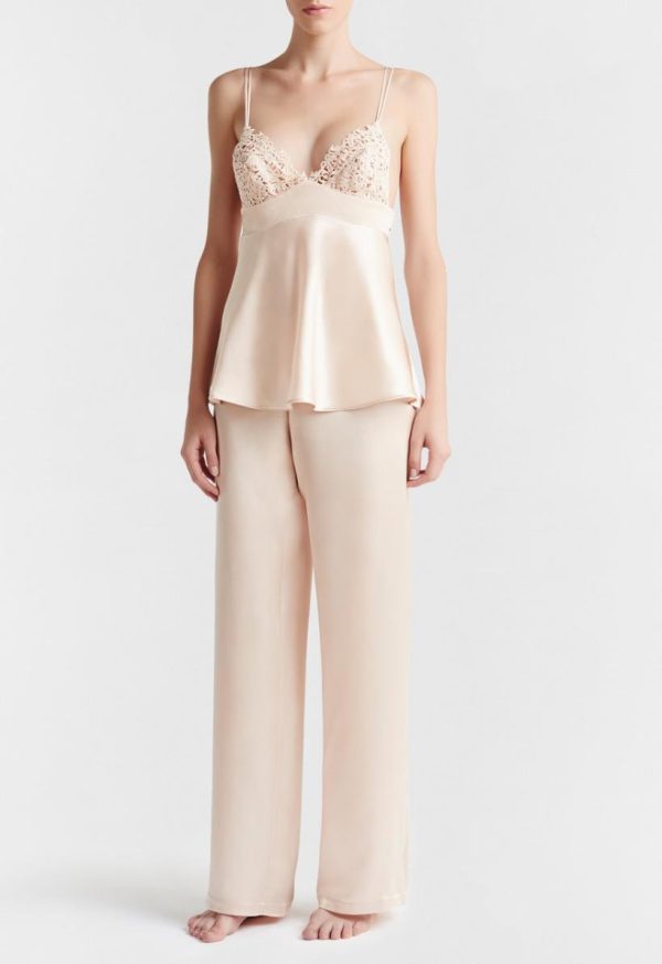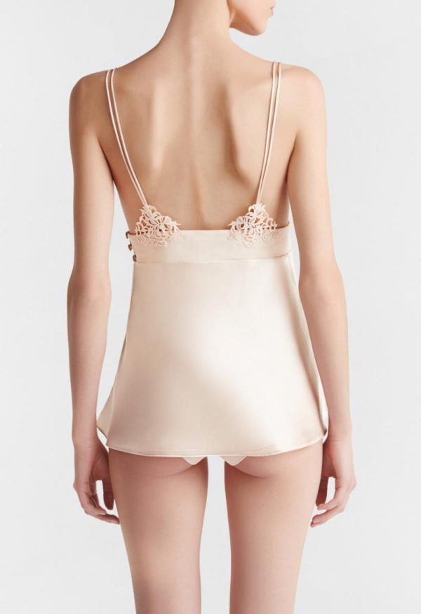 Camisole in pure silk satin embellished with refined macramé frastaglio appliqué. Details in stretch silk organza. Made in Italy.