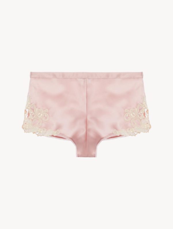 La Perla Maison captures the true spirit of its Made in Italy heritage. Defined by an antique Florentine technique of applying embroidery by hand, this unique piece can take up to two days to create.Crafted from a weightless powder pink silk-satin, the Maison French knickers embody qualities of preciousness and individuality. The hand-placed ivory frastaglio trails seductively to each side creating an alluring effect. The partially elasticated waist ensures comfort while the two button closure is an elegant touch. Pair with matching Maison camisole for a timeless set.