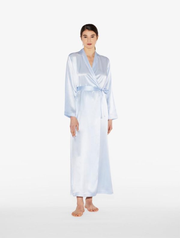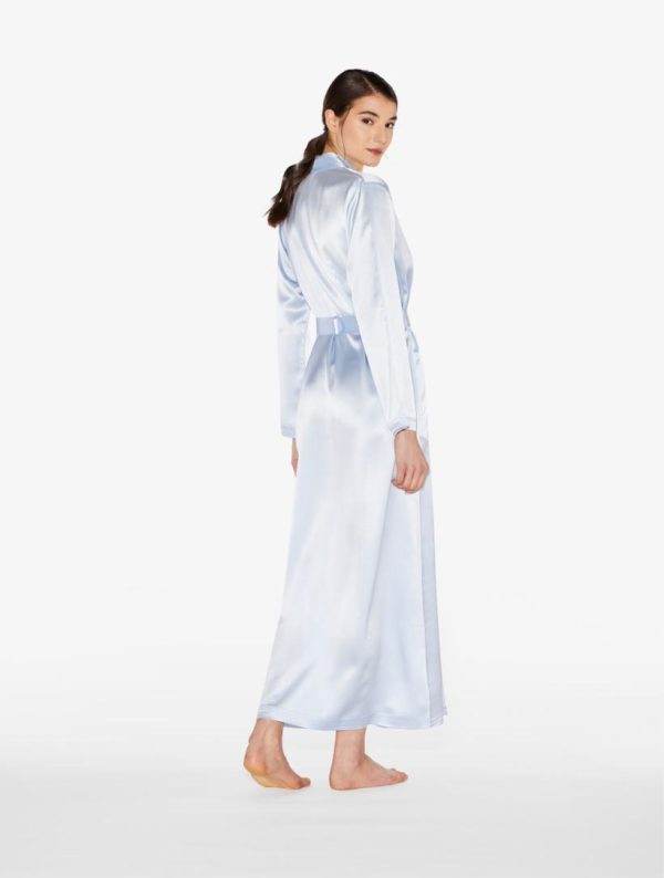 A long silk robe that creates a luxurious mood with its lustrous finish and sumptuous feel. Comfortable and classic, it features a soft collar, a waist belt, side pockets and subtle top-stitching detail to finish the hem and cuffs. Wear over the matching long silk slip.